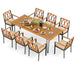 ● Includes a rectangular table and 8 chairs● Made with natural acacia wood with a splinter-free and long-lasting surface● Spacious tabletop meets various needs● Comfy sitting experience with inclined backrests and wide armrests● Equipped with soft padded seat cushions● Easy to upkeep with removable zippered cushion covers ● Accommodates a patio umbrella with a 2-inch umbrella hole● High stability with adjustable foot pads● Reliable durability with a metal frame● Note: The whole set will come in 5 boxes and the time of receipt may vary